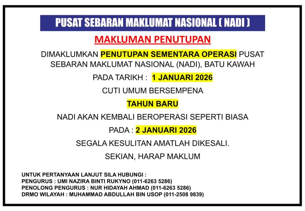 NADI Batu Kawah akan ditutup sementara pada 1 Januari 2026 sempena Cuti Umum Tahun Baru.