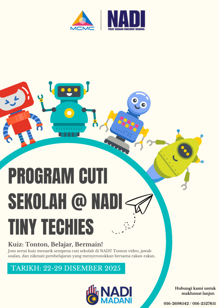 Program Cuti Sekolah @ NADI – Tiny Techies akan dilaksanakan bermula 22 Disember 2025 hingga 29 Disember 2025 di semua NADI seluruh Malaysia.