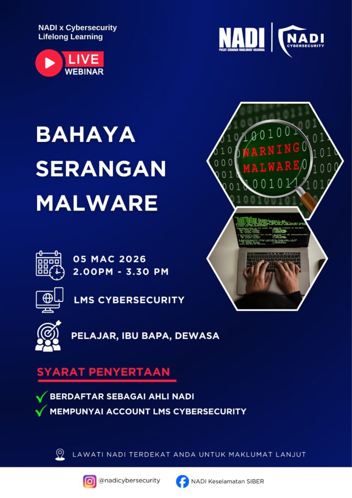 Anda dijemput untuk menyertai sesi Live Webinar anjuran NADI x Cybersecurity yang akan membincangkan tentang bahaya serangan malware serta langkah-langkah melindungi diri daripada ancaman siber.