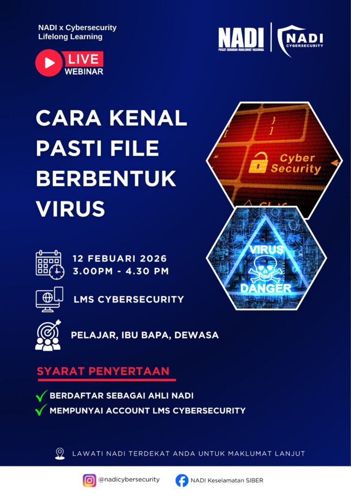 Dalam era digital hari ini, fail berbahaya boleh tersebar melalui e-mel, WhatsApp, Telegram dan laman web tanpa kita sedari. Webinar ini akan membantu anda: