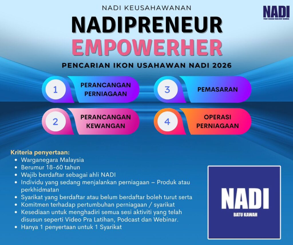 Program NADIPRENEUR EMPOWERHER 2026 merupakan inisiatif untuk mengenal pasti dan membangunkan usahawan NADI yang berpotensi menjadi ikon dalam komuniti.